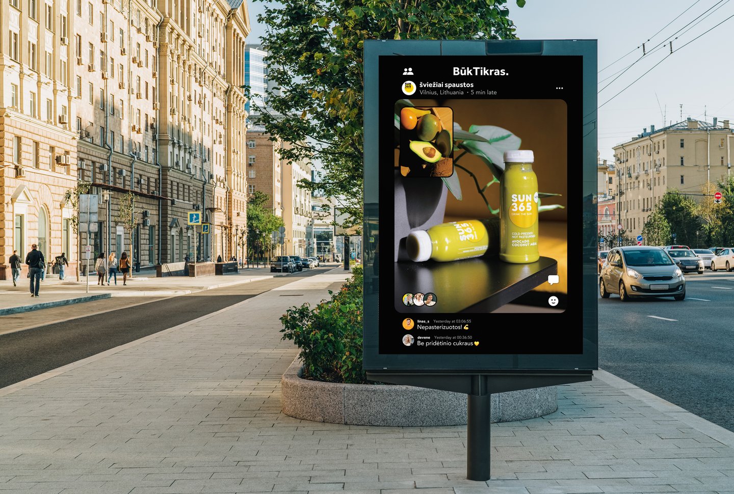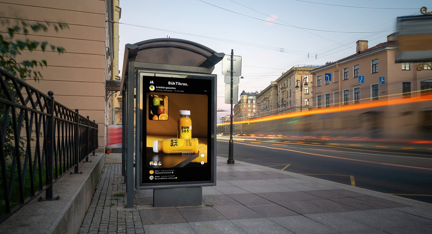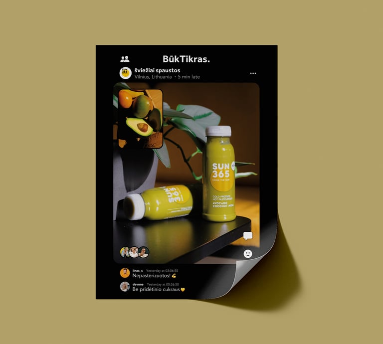 Kuo čia dėtas SUN365juices? Šiam prekės ženklui nėra idėjiškai artimesnio socialinio tinklo nei BeReal! BūkTikras, kad SUN365 taip pat yra tikra. Juk tai tiesiog šviežiai spausti vaisiai bei daržovės ir nieko daugiau. Jokio pridėto cukraus, jokių maistinių priedų, jokių dažiklių. Pastovėjusios lentynoje SUN365 sultys natūraliai susisluoksniuoja, jų skonis varijuoja priklausomai nuo sezono: kartais sultys saldesnės, kartais rūgštesnės. Juk dviejų identiškų mangų ar apelsinų pasaulyje nerasite!
