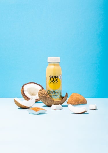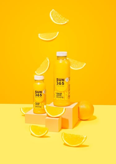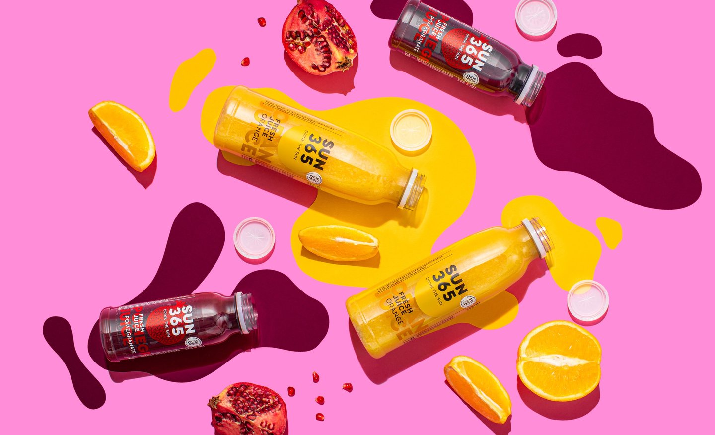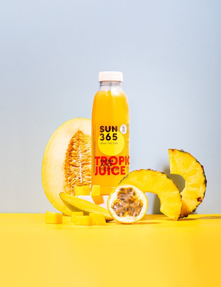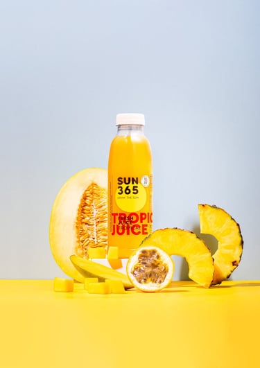 Šios SUN365 sulčių pakuotės perteikia prekės ženklo esmę – natūralumą, energiją ir kasdienį saulės įkvėpimą. Ryškios spalvos vizualiai atspindi pagrindinius ingredientus (mangas, kokosai, avokadas), o minimalistinis, modernus dizainas užtikrina aiškų, greitai atpažįstamą prekės įvaizdį.
