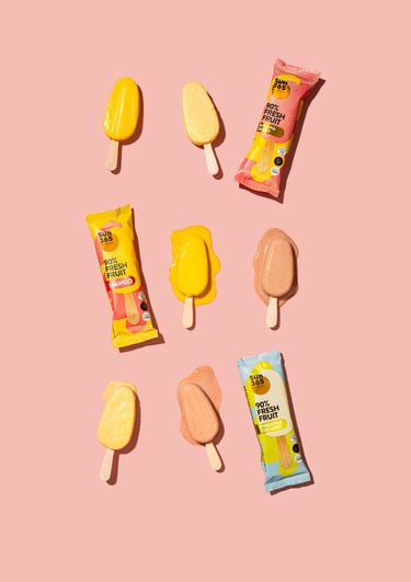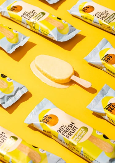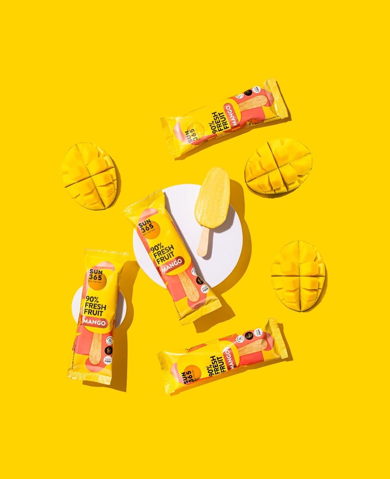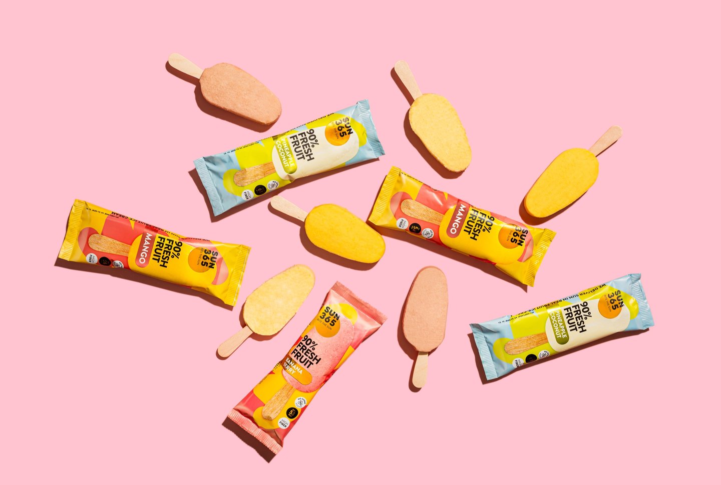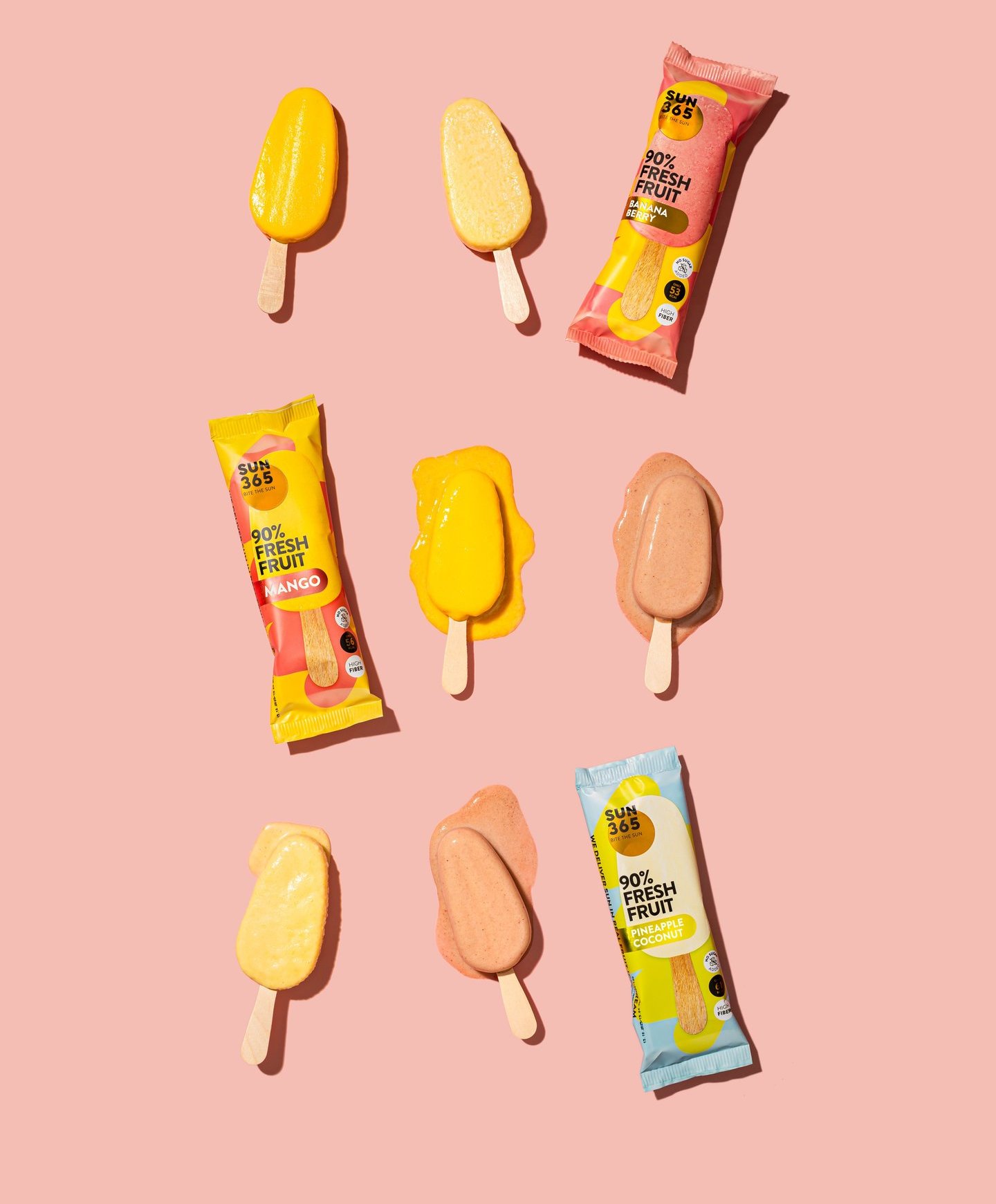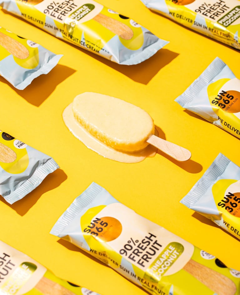 Šios SUN365 ledų pakuotės perteikia prekės ženklo esmę – natūralumą, energiją ir kasdienį saulės įkvėpimą. Ryškios spalvos vizualiai atspindi pagrindinius ingredientus (bananas, mango, uogos), o minimalistinis, modernus dizainas užtikrina aiškų, greitai atpažįstamą prekės įvaizdį.