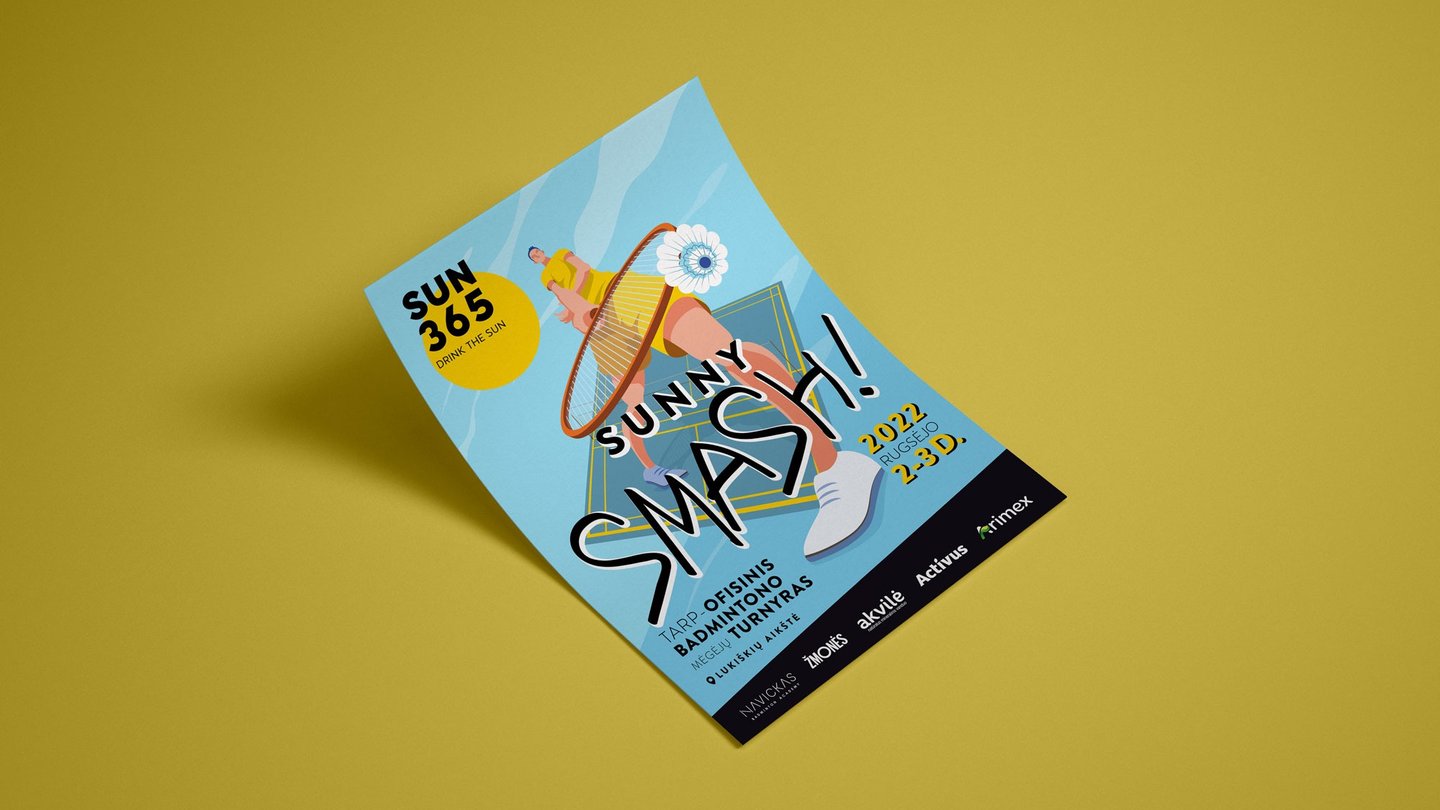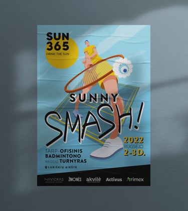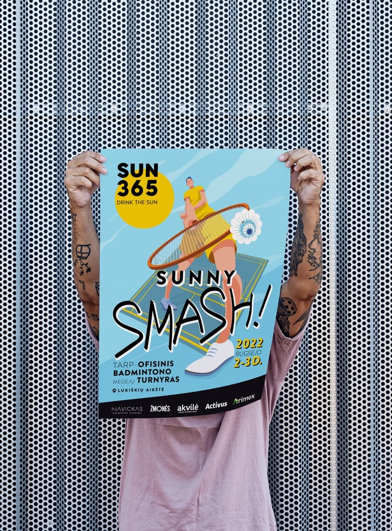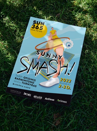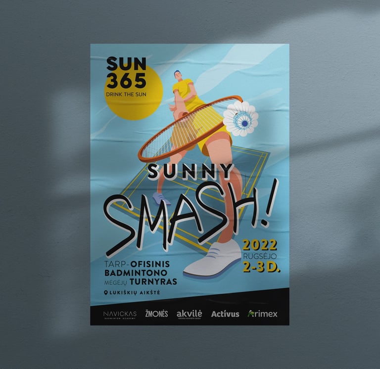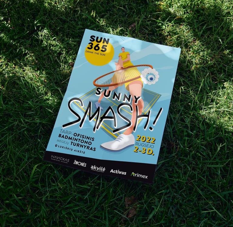 Saulėtas ir žaismingas SUNNY SMASH badmintono turnyro įvaizdis. Plakatai, skrajutės, socialiniai tinklai, foto sienos - viskas ko reikia turnyrui!