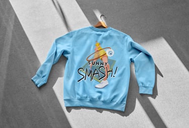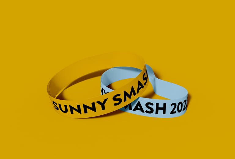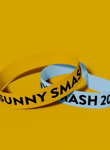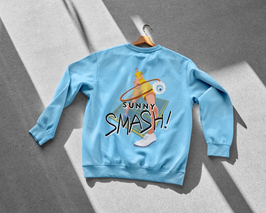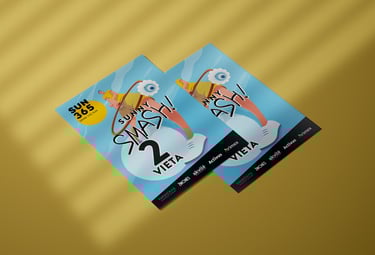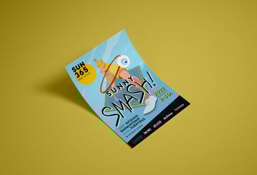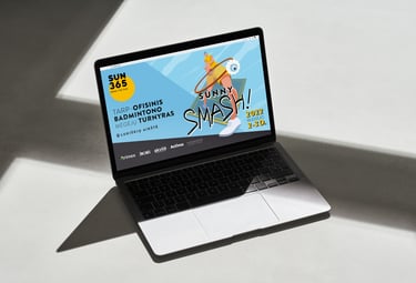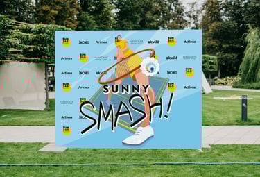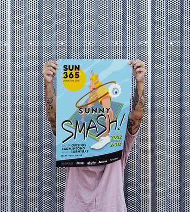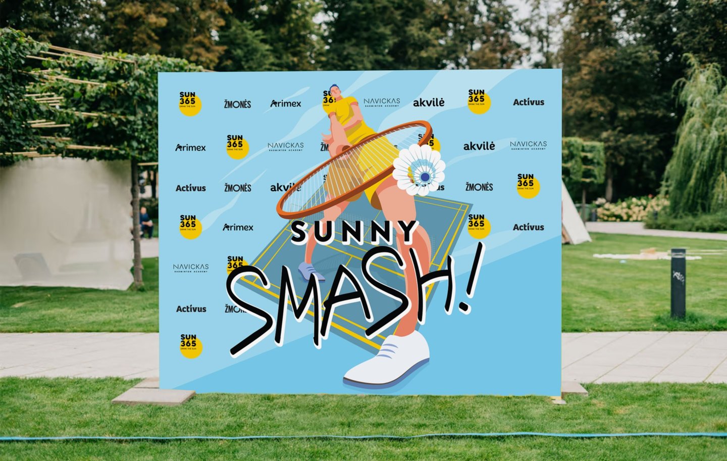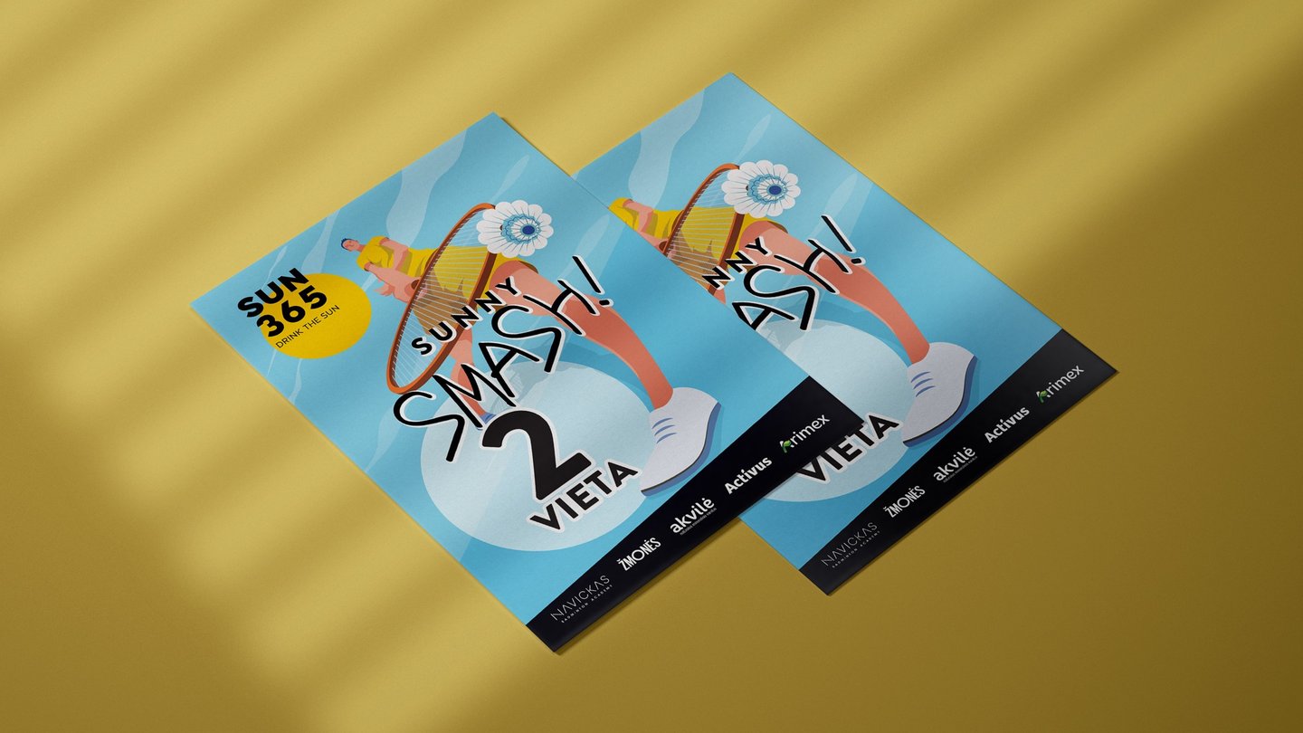 Saulėtas ir žaismingas SUNNY SMASH badmintono turnyro įvaizdis. Plakatai, skrajutės, socialiniai tinklai, foto sienos - viskas ko reikia turnyrui!